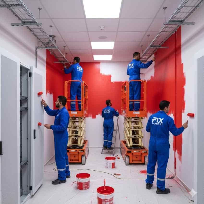 تصور کنید تیمی حرفه‌ای در حال رنگ‌آمیزی با اسپری در اتاق سرور، با ماسک‌های ایمنی و پوشش یکنواخت دیوارها.